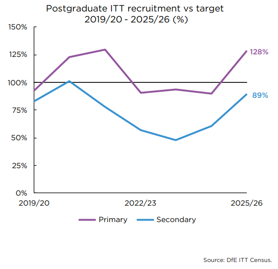 The shift is visible in the recruitment data. In 2025/26, secondary postgraduate ITT recruitment reached 89% of target, up sharply from the previous year, while primary recruitment exceeded target with around 9,800 recruits against a target of 7,700. Early data for 2026/27 is also encouraging, although NFER still forecasts overall secondary recruitment to remain below target.