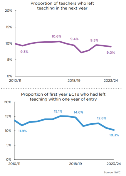 Retention has improved too. NFER reports that 9% of teachers left the state school system between 2023/24 and 2024/25, a slightly better rate than in the previous two years. The exit rate for first-year early career teachers fell to 10.3%, the lowest on record. NFER also highlights job satisfaction, leadership support, pupil behaviour, pay satisfaction and workload as significant factors associated with teacher retention.