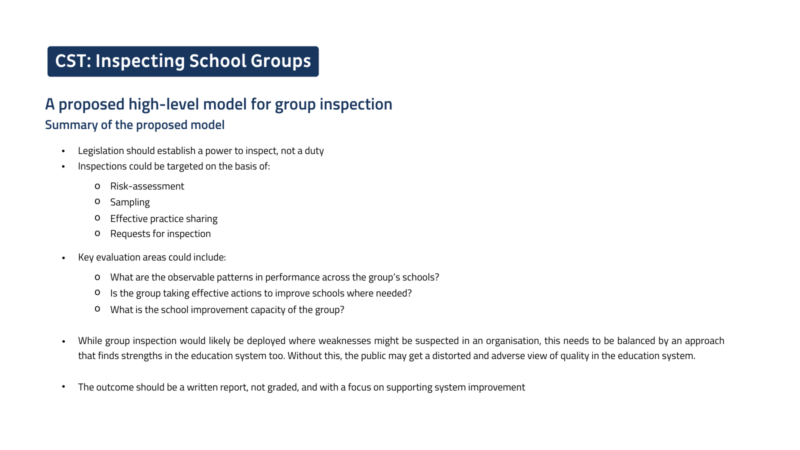 CST highlights that the “introduction of inspection of school groups is largely uncharted territory. It is complex work, and it will need to navigate a range of competing tensions and unintended consequences. It is vital, therefore, that time is taken to develop the best approach. It should not be rushed.” Their Policy paper “Inspecting school groups” is insightful for ideas around how this could look.